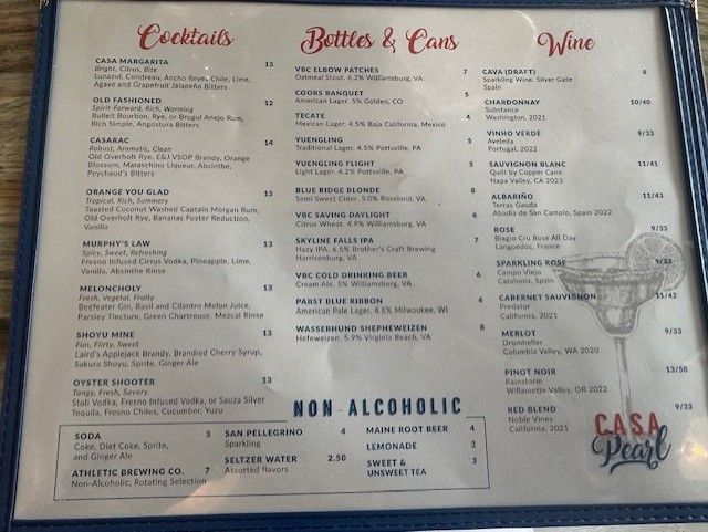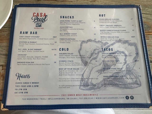 A few years ago I was at Casa Pearl during the time the population was trying to recover from the pandemic. A group of us went to Casa Pearl for dinner, but it really turned out that most of us ended up sharing lots of appetizers. We were seated in an outdoor covered tent. All I can remember from that time is that everything was good. So why haven’t we been back since? Not sure I have an excuse except that maybe seafood isn’t my husband’s favorite first choice. It’s a favorite for a lot of our friends. Heck, we even know the bartender that has been there for a few years now. Really no good excuse. That will change now.