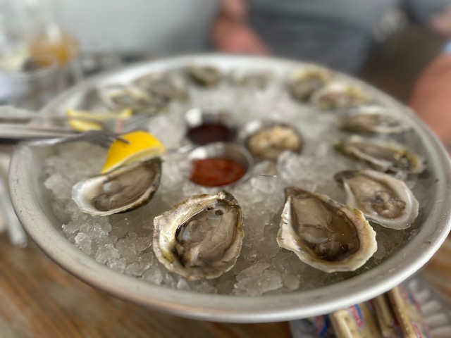 We ordered quite a few appetizers, starting with a dozen “Oysters on the Half Shell”. They have a list of oysters from different areas with a description of the oysters. You choose, as they should if you are going to be famous for your oysters. They were served with my favorite red wine mignonette (I always call it the vinegar sauce), cocktail sauce, and horseradish. All amazing. Oh, I don’t want to forget their own hot sauce. I put a couple of drops on each of my oysters. Great flavor and not overwhelming heat which I do not like. Perfect heat for me and with flavor. Back to the oysters. They were so good we got another dozen. We also had the “Ceviche”. Fresh fish tossed with avocado and taro root. It was supposed to have jalapeño and pickled garlic. I’m sure it was there because the flavor was amazing, I just didn’t notice it. Served with chips that were great on their own, but I put some of the mixture onto a chip… excellent! It was very fresh and so good. I have had some not so good Ceviche in the past, so I usually won’t order it because it’s always a hit and miss. This one was a hit! We also had the smoked fish dip. If you like smoked food, you will love this dip… again very good. Brussels sprouts made one of my favorite ways, slightly roasted. They were dressed with a lemon-caper vinaigrette and small shreds of parmesan. Last but not least was the “Scream” Corn which was their take on a Mexican street corn but a creamy version. Something I will always order if a restaurant offers it. It was one of their food features that day. It was creamy, with a few BBQ spiced corn nuts, some queso fresco, and flavored with lime and jalapeño. Interesting but again very good.