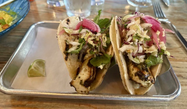 Now for dinner, I usually gravitate towards any salad that sounds good or get a side salad. But since one of our friends was going to order the Golden Salad, I decided to wait until another time so I could see it. That is because the ingredients had me intrigued. It has napa cabbage, avocado, peanuts, herbs, dressed in a Sambal Nuoc Cham, which is a traditional Vietnamese dipping sauce. Right up my ally..Asian flair. This salad was her go-to when they eat here. If you want an add-on, they offer fried chicken, grilled fish, or fried oysters. I knew the Golden Salad would be good for it to be our friend’s go-to, and it looked amazing. I was eyeing their grilled fish taco that night (Wahoo was the market fish of the day), so that is what I got. Gotta remember they are known for their Oysters and Tacos. It came with chimichurri, red cabbage, mint, cilantro-soy aioli. I opted without the mint due to an episode I had once and didn’t want a repeat. Although I’m not convinced mint was the reason, I didn’t want to take a chance. I ordered two, and each was served with two white corn tortillas. I didn’t use the second tortilla it came with on each taco. They held up well with just one, and I always reduce the bread, etc., whenever I can for the main item to shine through, and this was no exception. I put a couple of drops of their signature hot sauce to give it a little kick, and they were soooooo good. The fish was cooked perfectly, and the flavors…yum! Husband ordered his own Ceviche for his dinner. Can’t go wrong there since we had already tried it for an appetizer.