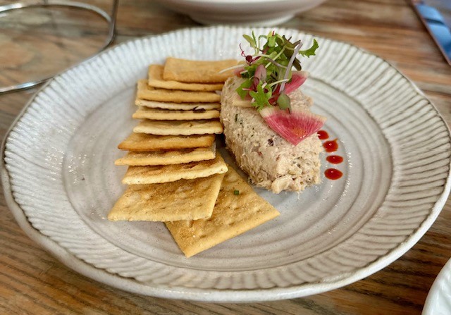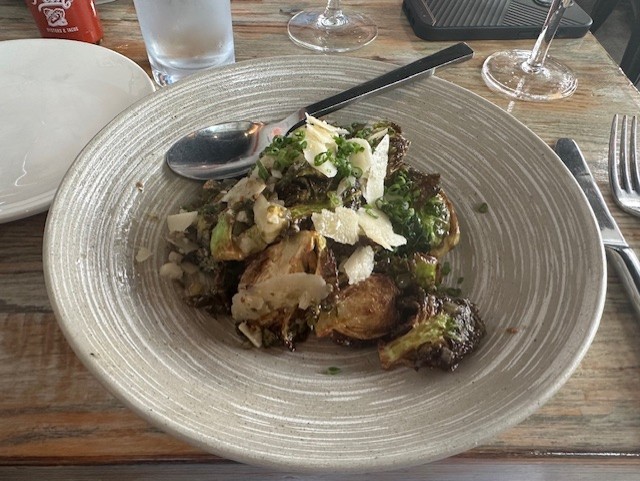 We ordered quite a few appetizers, starting with a dozen “Oysters on the Half Shell”. They have a list of oysters from different areas with a description of the oysters. You choose, as they should if you are going to be famous for your oysters. They were served with my favorite red wine mignonette (I always call it the vinegar sauce), cocktail sauce, and horseradish. All amazing. Oh, I don’t want to forget their own hot sauce. I put a couple of drops on each of my oysters. Great flavor and not overwhelming heat which I do not like. Perfect heat for me and with flavor. Back to the oysters. They were so good we got another dozen. We also had the “Ceviche”. Fresh fish tossed with avocado and taro root. It was supposed to have jalapeño and pickled garlic. I’m sure it was there because the flavor was amazing, I just didn’t notice it. Served with chips that were great on their own, but I put some of the mixture onto a chip… excellent! It was very fresh and so good. I have had some not so good Ceviche in the past, so I usually won’t order it because it’s always a hit and miss. This one was a hit! We also had the smoked fish dip. If you like smoked food, you will love this dip… again very good. Brussels sprouts made one of my favorite ways, slightly roasted. They were dressed with a lemon-caper vinaigrette and small shreds of parmesan. Last but not least was the “Scream” Corn which was their take on a Mexican street corn but a creamy version. Something I will always order if a restaurant offers it. It was one of their food features that day. It was creamy, with a few BBQ spiced corn nuts, some queso fresco, and flavored with lime and jalapeño. Interesting but again very good.