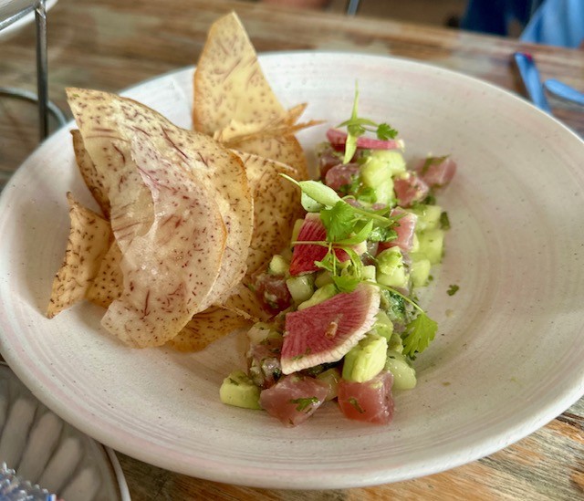 Now for dinner, I usually gravitate towards any salad that sounds good or get a side salad. But since one of our friends was going to order the Golden Salad, I decided to wait until another time so I could see it. That is because the ingredients had me intrigued. It has napa cabbage, avocado, peanuts, herbs, dressed in a Sambal Nuoc Cham, which is a traditional Vietnamese dipping sauce. Right up my ally..Asian flair. This salad was her go-to when they eat here. If you want an add-on, they offer fried chicken, grilled fish, or fried oysters. I knew the Golden Salad would be good for it to be our friend’s go-to, and it looked amazing. I was eyeing their grilled fish taco that night (Wahoo was the market fish of the day), so that is what I got. Gotta remember they are known for their Oysters and Tacos. It came with chimichurri, red cabbage, mint, cilantro-soy aioli. I opted without the mint due to an episode I had once and didn’t want a repeat. Although I’m not convinced mint was the reason, I didn’t want to take a chance. I ordered two, and each was served with two white corn tortillas. I didn’t use the second tortilla it came with on each taco. They held up well with just one, and I always reduce the bread, etc., whenever I can for the main item to shine through, and this was no exception. I put a couple of drops of their signature hot sauce to give it a little kick, and they were soooooo good. The fish was cooked perfectly, and the flavors…yum! Husband ordered his own Ceviche for his dinner. Can’t go wrong there since we had already tried it for an appetizer.